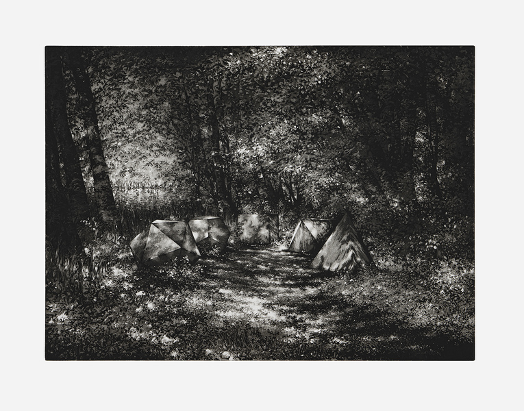 The focus of Stefanie Hofer's etchings is landscape: historically styled landscape gardens, contemporary land art objects that playfully engage with topography and space, and landscapes that emerge from industrial heritage sites. The artist travels to these sites, documenting and sketching them on location, and then processes this material in her studio. Through her drawings, she explores the conceptual world underlying these sites, formulating aesthetic, ecological, and thematic aspects into her own perspective.